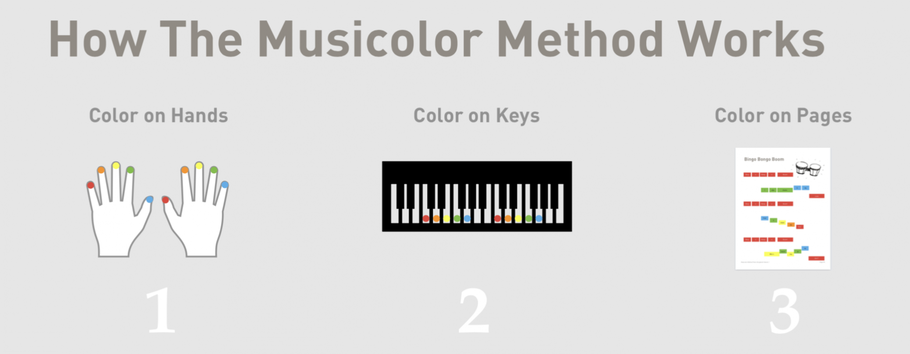 The Musicolor Method uses color notation as educational scaffolding to play piano fast – and then students learn all the fundamentals along the way.